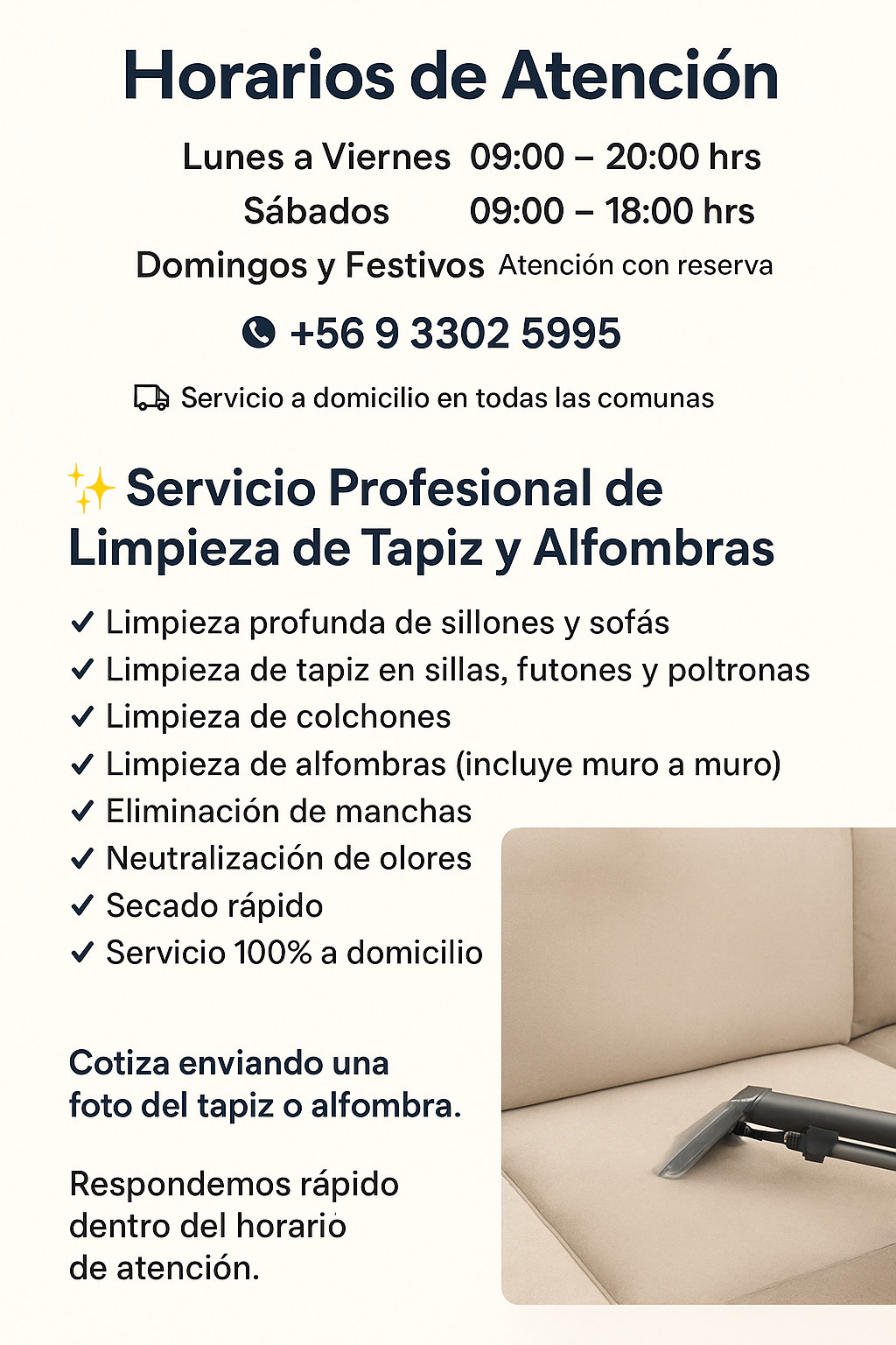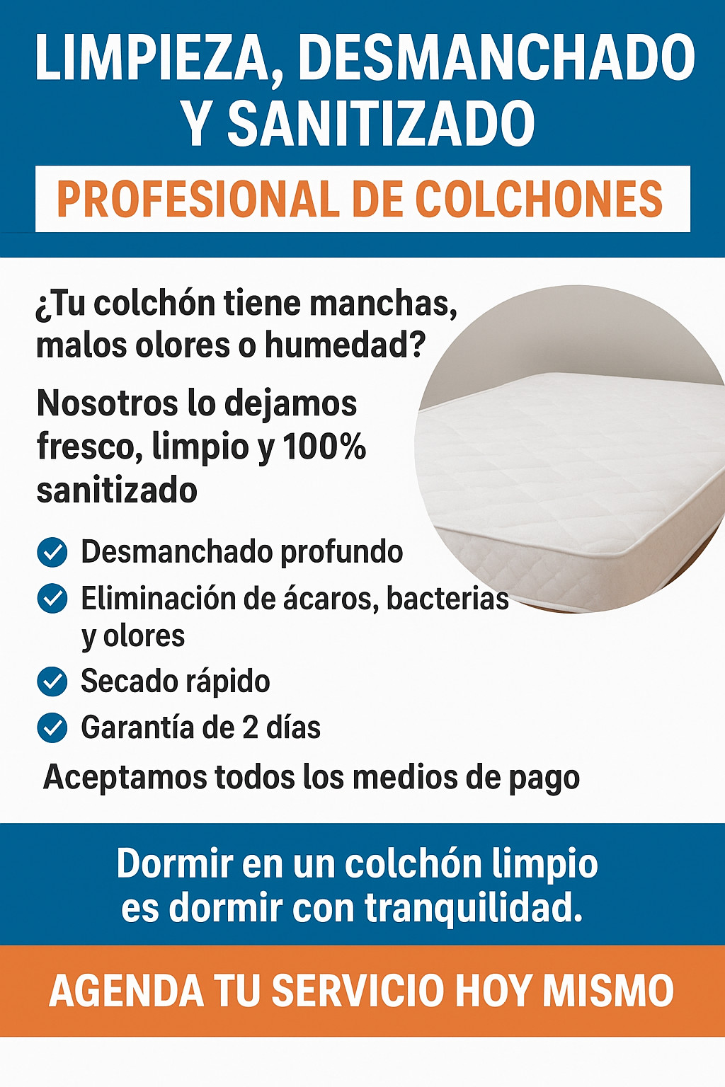 🛏️ Servicio de Limpieza, Desmanchado y Sanitizado de Colchones Hola 👋 ¡Gracias por comunicarte con nosotros! A continuación te explicamos nuestro proceso profesional de limpieza de colchón, para que tengas total claridad y confianza: --- 🔹 1. Inspección del colchón Revisamos el estado general, tipo de manchas, suciedad, olores y nivel de humedad para aplicar los productos adecuados sin dañar la tela. 🔹 2. Aspirado profundo Utilizamos aspiradoras de alta potencia para remover polvo, ácaros, restos de piel, pelos y suciedad acumulada en la superficie y capas internas. 🔹 3. Aplicación de productos desmanchadores Usamos productos profesionales especiales para: Manchas de sudor Orina Derrames Humedad Alimentos u otros agentes Trabajamos cada mancha de forma individual para obtener el mejor resultado posible. 🔹 4. Cepillado suave Cepillamos la superficie para activar el producto y desprender la suciedad adherida. 🔹 5. Limpieza profunda con máquina inyección–succión Esta máquina profesional: Inyecta agua y detergente especializado Remueve suciedad interna Succiona toda el agua sucia hacia un contenedor El proceso deja el colchón limpio, fresco y sin exceso de humedad. 🔹 6. Sanitización antibacteriana Aplicamos un sanitizante grado profesional que elimina: Ácaros Hongos Bacterias Olores Esto deja tu colchón desinfectado y seguro para dormir. 🔹 7. Secado acelerado Terminamos con un secado asistido para que el colchón quede prácticamente seco en pocas horas. --- ✅ Resultados del servicio Colchón limpio y desmanchado Eliminación de malos olores Desinfección total Mejora en la salud del descanso Apto para niños, adultos y mascotas